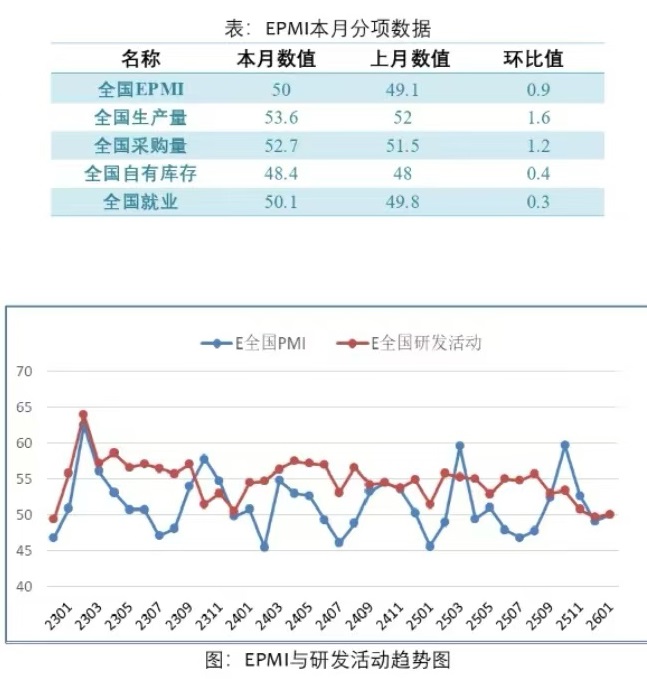 具体观察各项指标,EPMI指标为50%,比上月回升0.9个百分点。生产量指标为53.6%,比上月回升1.6个百分点。产品订货环比上月回升1.5个百分点。自有库存指标为48.4%,比上月回升0.4个百分点。就业指标为50.1%,比上月回升0.3个百分点。