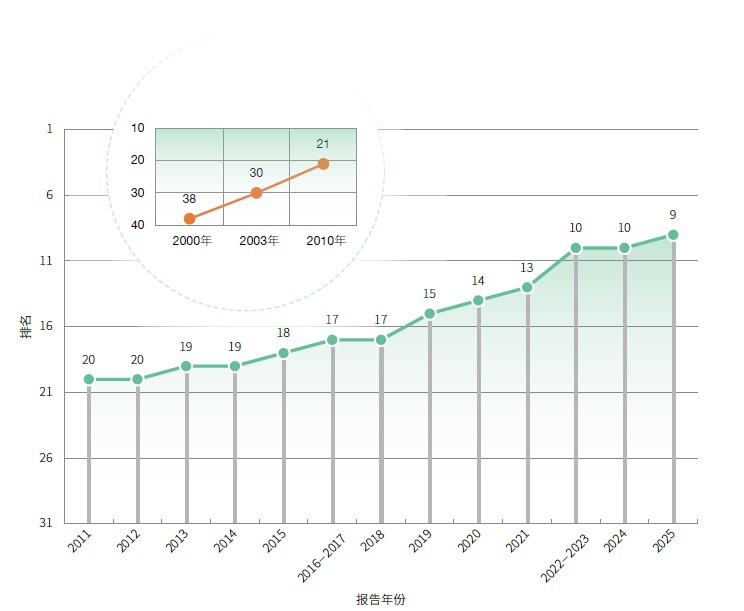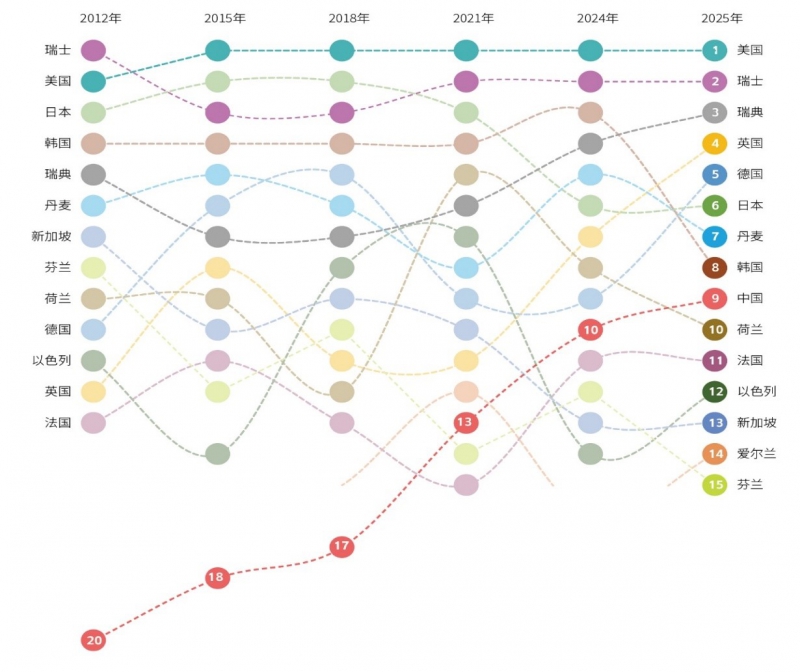 结果显示,2025年,位列世界前十位的国家依次为美国、瑞士、瑞典、英国、德国、日本、丹麦、韩国、中国和荷兰。与上年相比,我国国家创新指数综合排名前进1位,提升至世界第9位,向创新型国家前列和科技强国目标稳步迈进。相比2012年,我国综合排名提升了11个位次,是近十余年来进步最快的国家,也是唯一进入世界前十行列的中等收入国家。