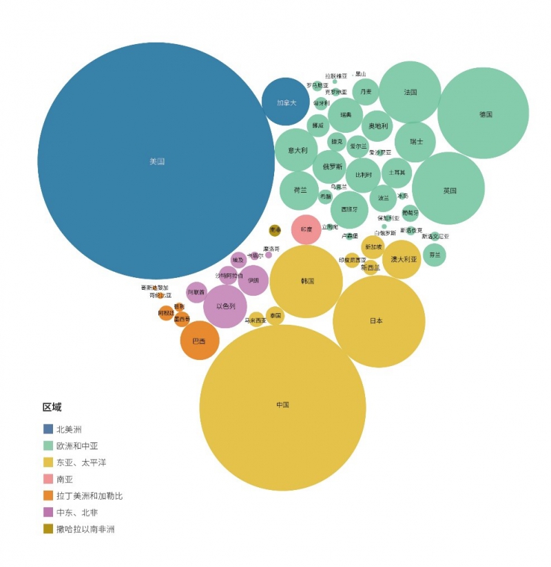 图5 各国研发经费支出规模的地区分布