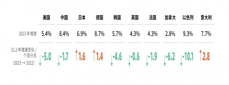 2023年,全球 R&D 经费投入(以美元计)较上年增长 5.2% 左右,高于全球经济增长速度。主要国家研发经费投入持续增长。世界R&D经费投入排名前十国家为美国、中国、日本、德国、韩国、英国、法国、加拿大、以色列、意大利,但其中有7 个国家R&D经费增速下降。中国R&D经费投入增速在主要大国中仍处于较高水平,与德国增速基本相当,高于美国、日本、英国、法国、韩国等国家。