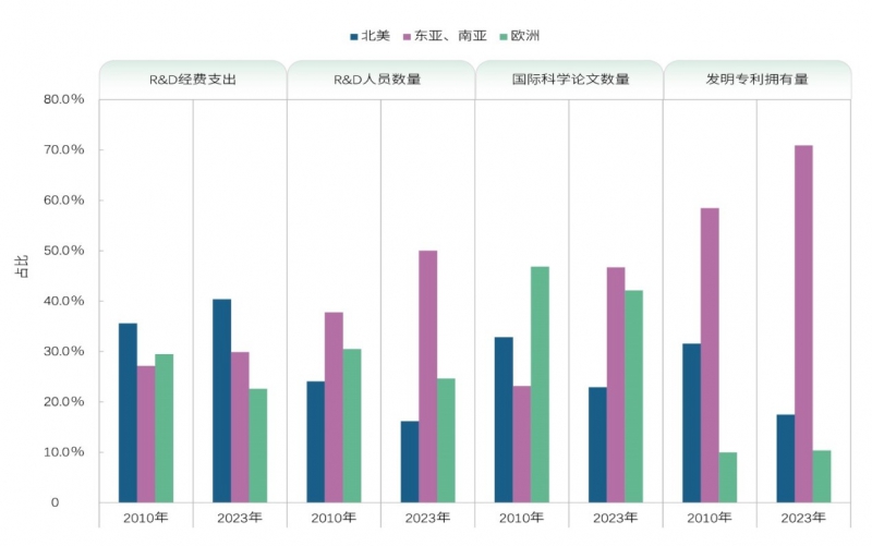 五、欧洲研发投入份额下降明显,全球科技创新产出重心东移趋势更加显著