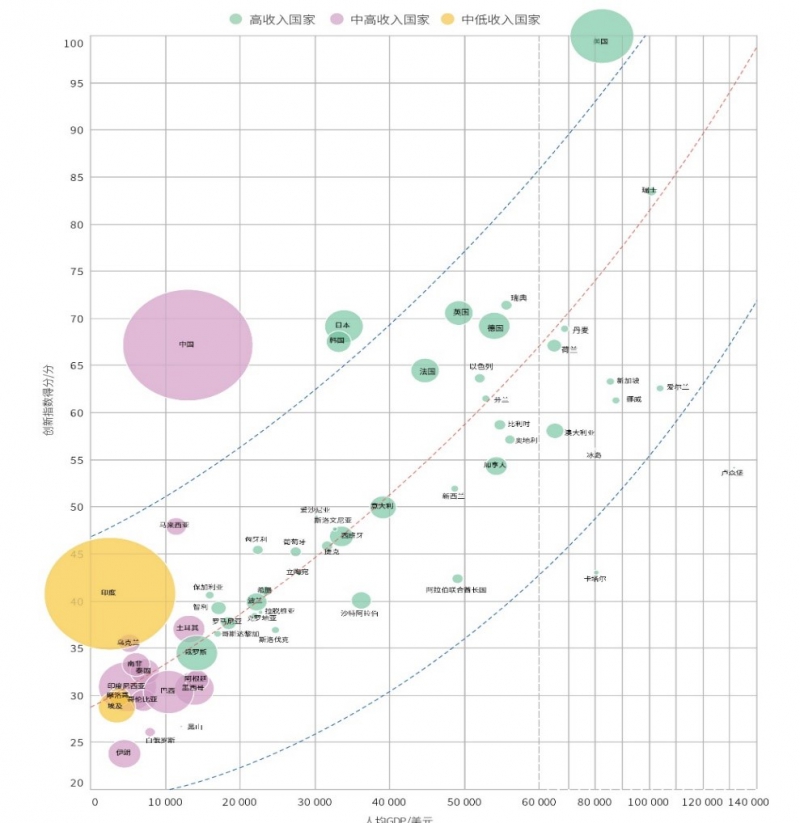 从具体得分看,中国国家创新指数得分为67.2分,主要指标增速高于发达国家水平。总体来看,中国创新能力接近人均GDP 在5 万美元左右的发达国家,且仍处于稳步上升的通道。